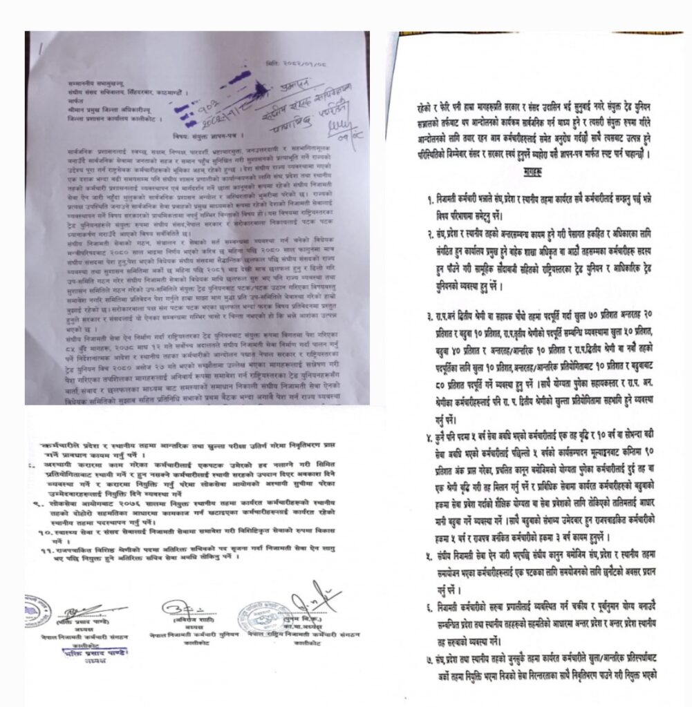 नेपाल निजामती कर्मचारी संगठन, नेपाल निजामती कर्मचारी युनियन र नेपाल राष्ट्रिय निजामती कर्मचारी संगठनका प्रतिनिधिहरूको उपस्थितिमा प्रमुख जिल्ला अधिकारीमार्फत संघीय संसद सचिवालय, सिंहदरबार काठमाडौँलाई संयुक्त ज्ञापनपत्र बुझाइएको हो।