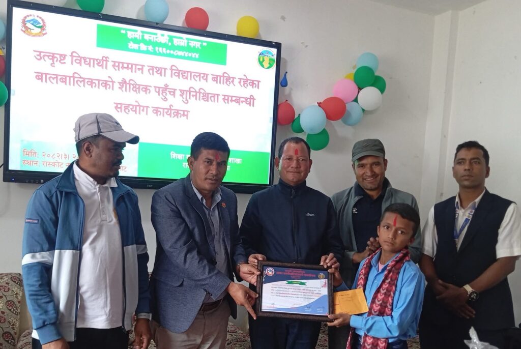 कालिकोट/रास्कोट नगरपालिकाले शैक्षिक सत्र २०८१ मा कक्षा ५ र कक्षा ८ का उत्कृष्ट विद्यार्थीहरूलाई सम्मानित गर्दै पुरस्कृत गरेको छ। “समृद्ध रास्कोट सबैको इच्छा, एकमात्र विकल्प गुणस्तरीय शिक्षा” भन्ने मूल नाराका साथ आयोजित विशेष कार्यक्रममा विद्यार्थीहरूलाई नगदसहित शैक्षिक सामग्री प्रदान गरिएको हो।