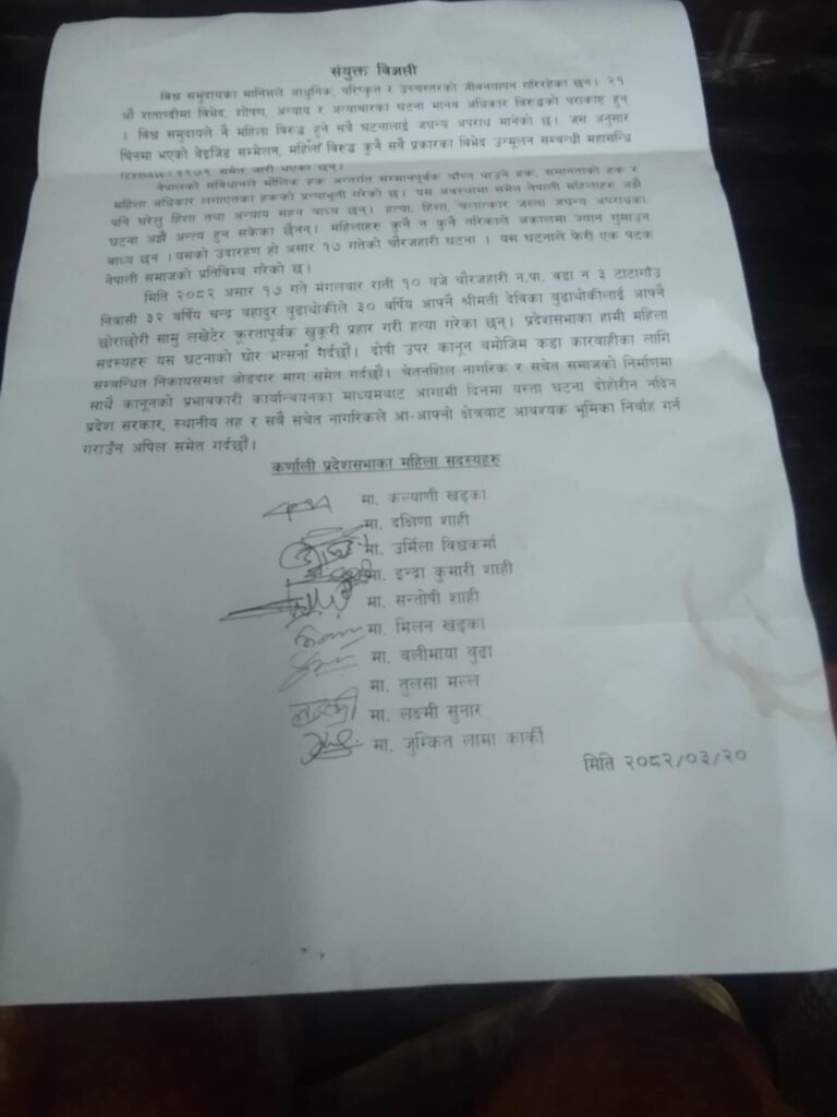 “यसरी श्रीमानको हातबाट श्रीमती काटिनु र मारिनु सामान्य कुरा होइन। महिलाहरूको सुरक्षाको ग्यारेन्टी दिन कर्णाली प्रदेश सरकारले कडा कानुन ल्याउनु पर्छ।”