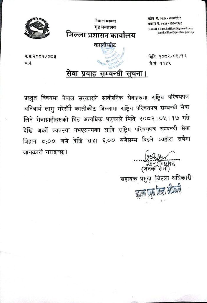 सहायक प्रमुख जिल्ला अधिकारी जनक शर्माले सेवाग्राहीको भीड व्यवस्थापन गर्न सेवा अवधि बढाइएको जानकारी दिनुभयो। उहाँले सेवाग्राहीको चाप नघटेसम्म यो समयतालिका कायम रहने स्पष्ट पार्नुभयो।